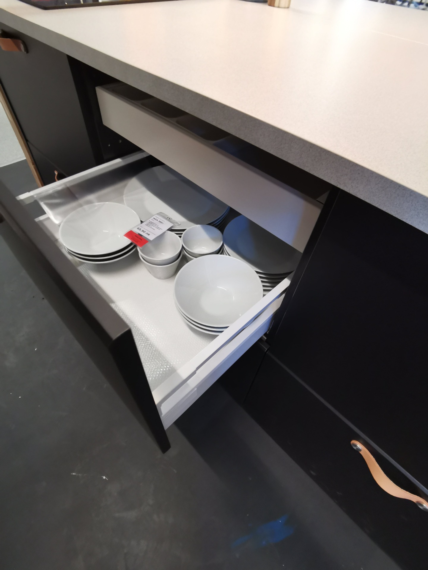 IKEA kungsbacka Anthracite with kitchen island. This kitchen is equipped with Ekbacken countertop and Välbildad Induction hob and Matälskare oven. Delsjön kitchen faucet with Boholmen sink. Råkall fridge. Cabinets and drawers are equipped with Östernäs leather handles. The NCS color code for Kungsbacka Anthracite is S 8500-N Gloss 5.