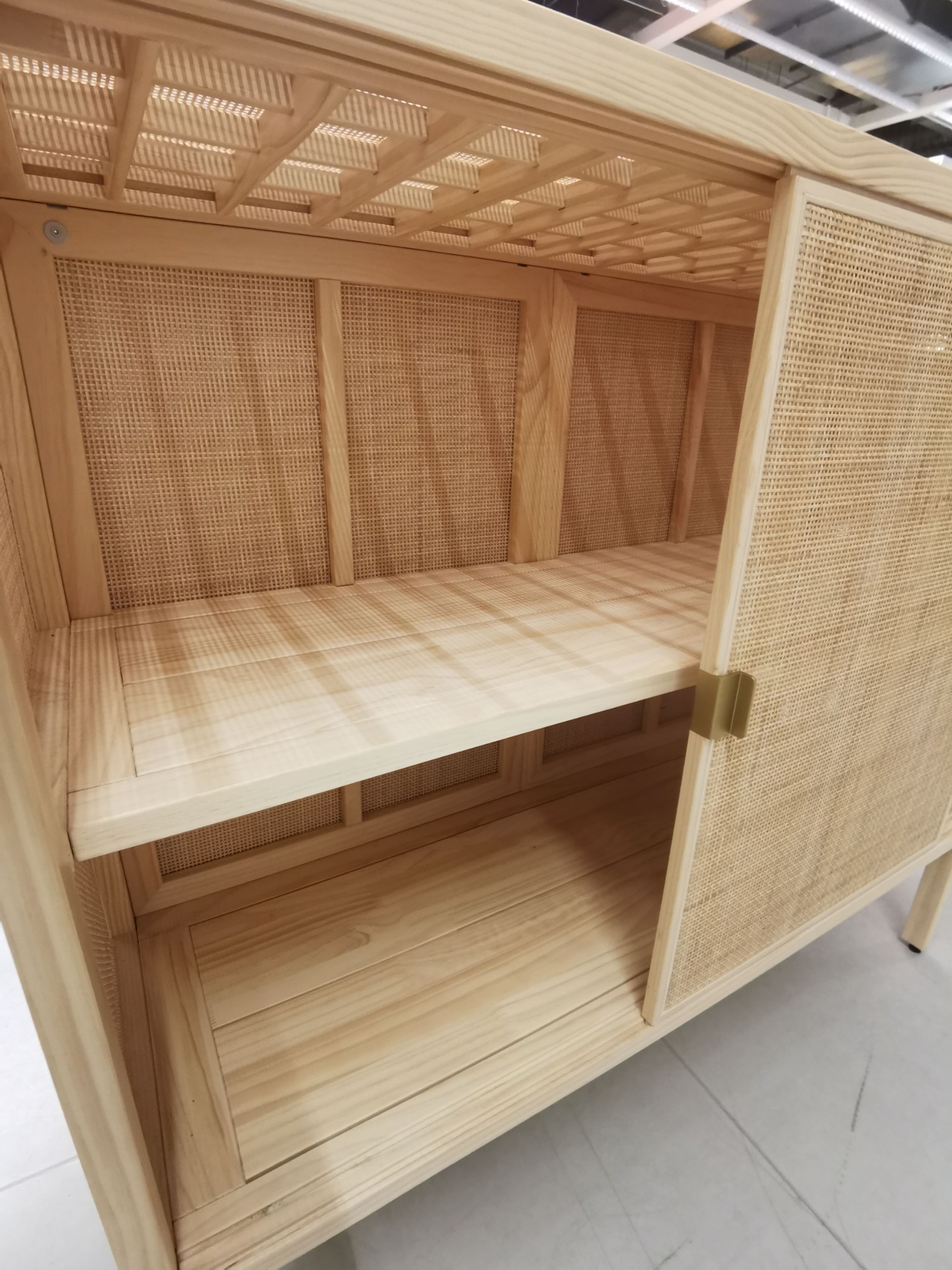 One of the most striking parts of the STOCKHOLM collection is the dining room furniture. The oak veneer dining table offers a natural surface with soft lines, while the chairs feature woven rattan backs and comfortable leather seat pads. Together, they create a warm and inviting atmosphere that feels elegant yet relaxed.