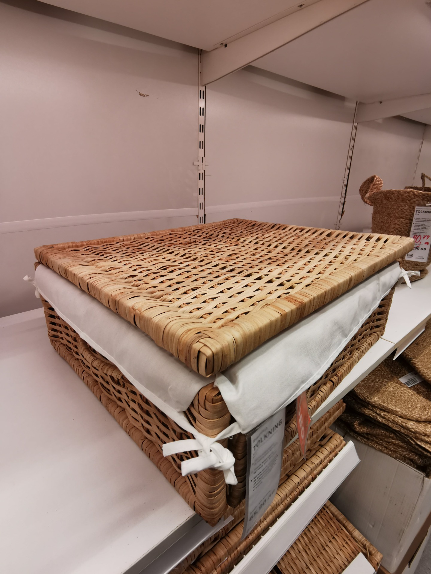 One example from the TOLKNING series is the lidded basket, which is no longer available at IKEA stores but perfectly reflects the series' craftsmanship and natural design language. With its woven rattan structure, soft fabric lining, and practical lid, it offers both style and functionality. Even though it is no longer part of the current collection, it remains a beautiful example of how the TOLKNING series combines elegance with everyday usability.
